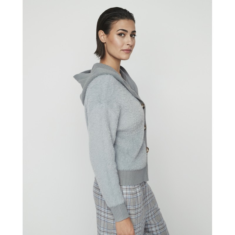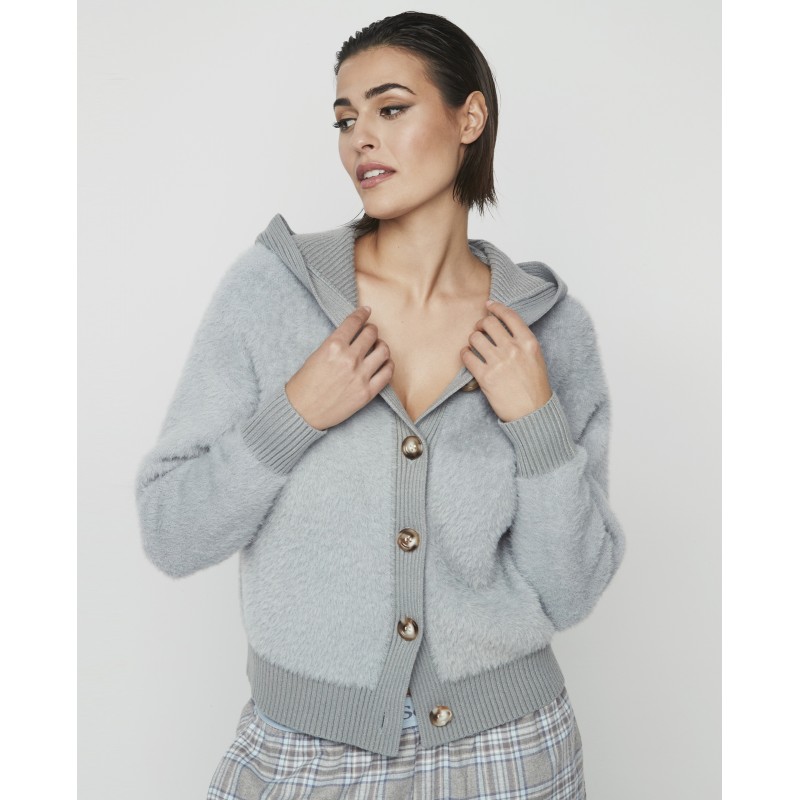 Women's short hooded jacket with front buttons. Ideal for staying warm and stylish this winter.