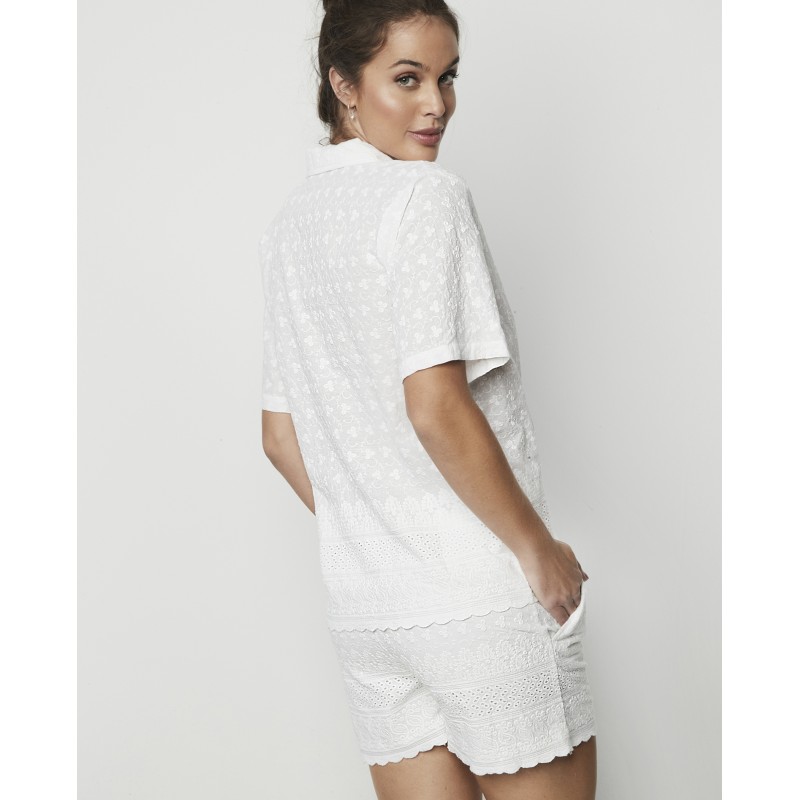 Short pyjamas made up of two 100% cotton pieces: short-sleeved shirt with button closure at the front and shorts with elastic at the waist. Its embroidered details and the combined border at both bottoms make it an elegant piece that is also comfortable and cool. Ideal for the summer season.