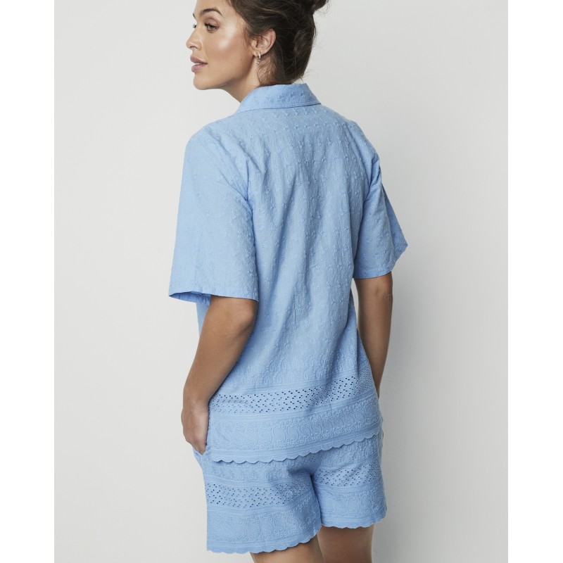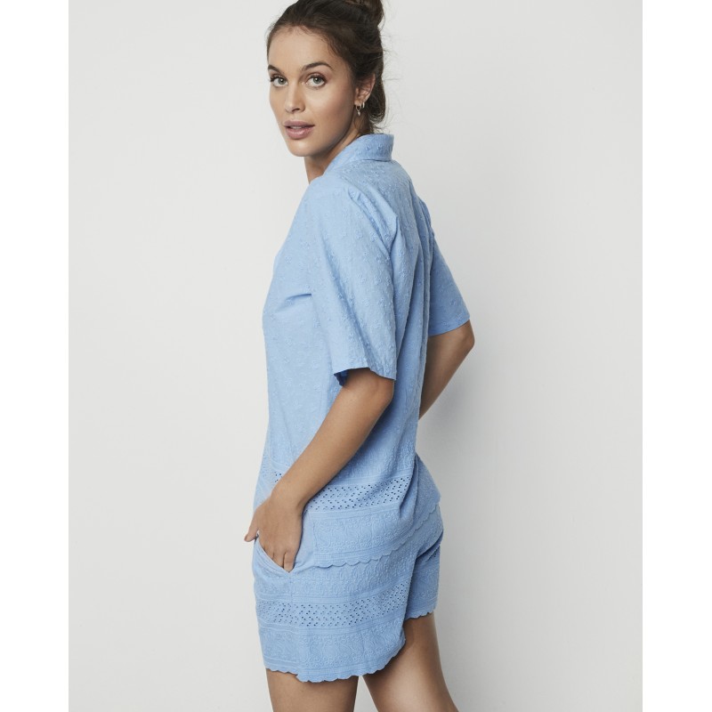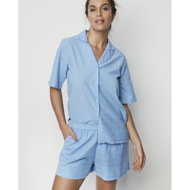 Short pyjamas made up of two 100% cotton pieces: short-sleeved shirt with button closure at the front and shorts with elastic at the waist. Its embroidered details and the combined border at both bottoms make it an elegant piece that is also comfortable and cool. Ideal for the summer season.