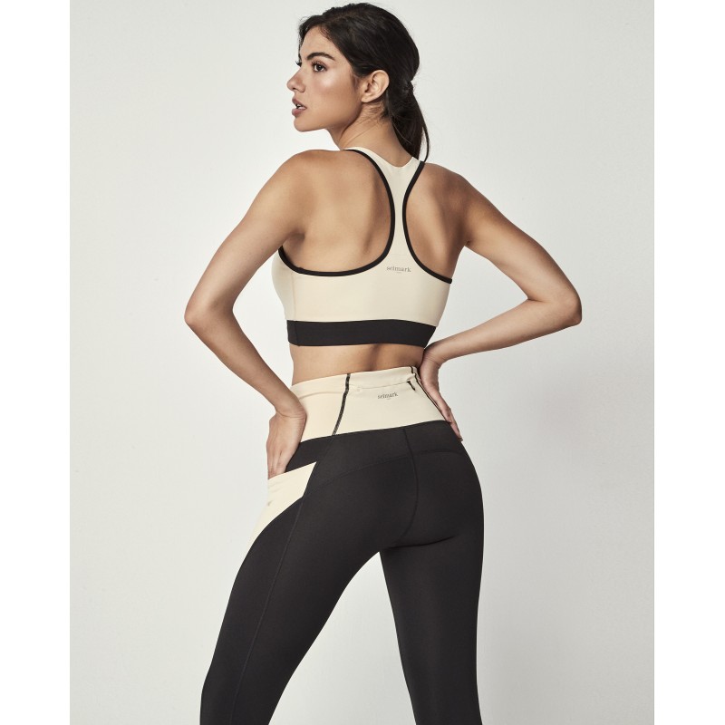 This sports bra is part of the new Selmark Tech collection by Pilar Rubio. It has a covered front zip closure to avoid contact with the skin, removable cups, and inner elastic at the bottom for maximum support. It is lined inside with control tulle. Ideal for keeping the chest supported and firm, guaranteeing freedom of movement during physical activity.