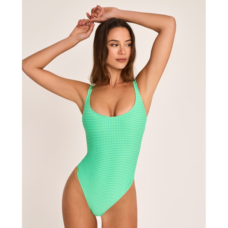 Square-neck swimsuit without cups, underwire, or padding. With adjustable straps. This piece, in a luminous tone and delicate woven design, subtly and elegantly enhances the silhouette, while its built-in accessory adds a touch of originality to the look.