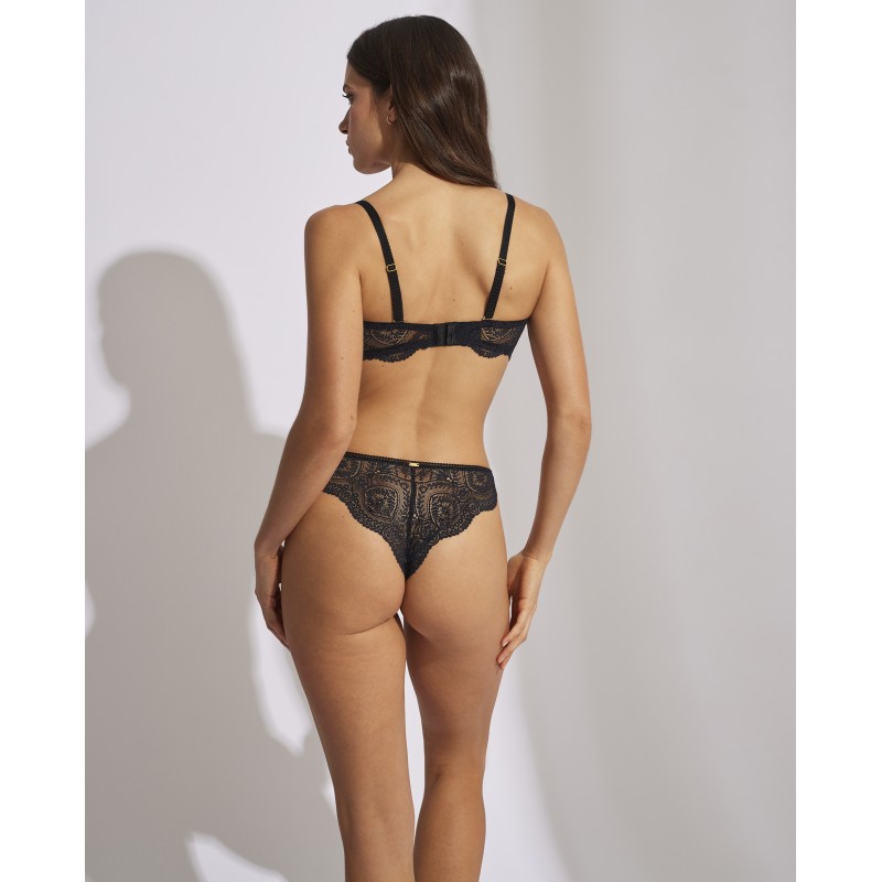 Bra with removable straps. With preformed foam and ring. It enhances the chest and guarantees good support, avoiding the unwanted sliding effect. Its spectacular lace design gives it a romantic and bohemian style at the same time. This garment combines sensuality, freshness and elegance, ideal for free and authentic women.