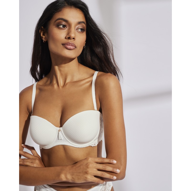 Bra with removable straps. With preformed foam and ring. It enhances the chest and guarantees good support, avoiding the unwanted sliding effect. Its spectacular lace design gives it a romantic and bohemian style at the same time. This garment combines sensuality, freshness and elegance, ideal for free and authentic women.