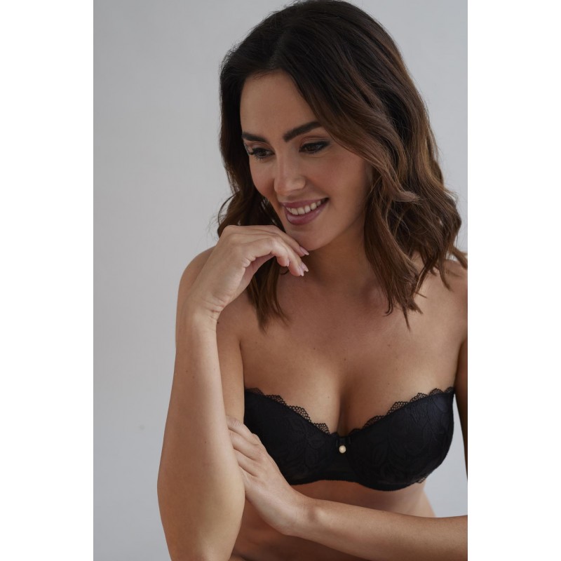 Padded strapless bra. Push up effect, enhances the chest and increases up to one size. Very attractive aesthetics and with character. Its floral lace makes it a very current and youthful design.