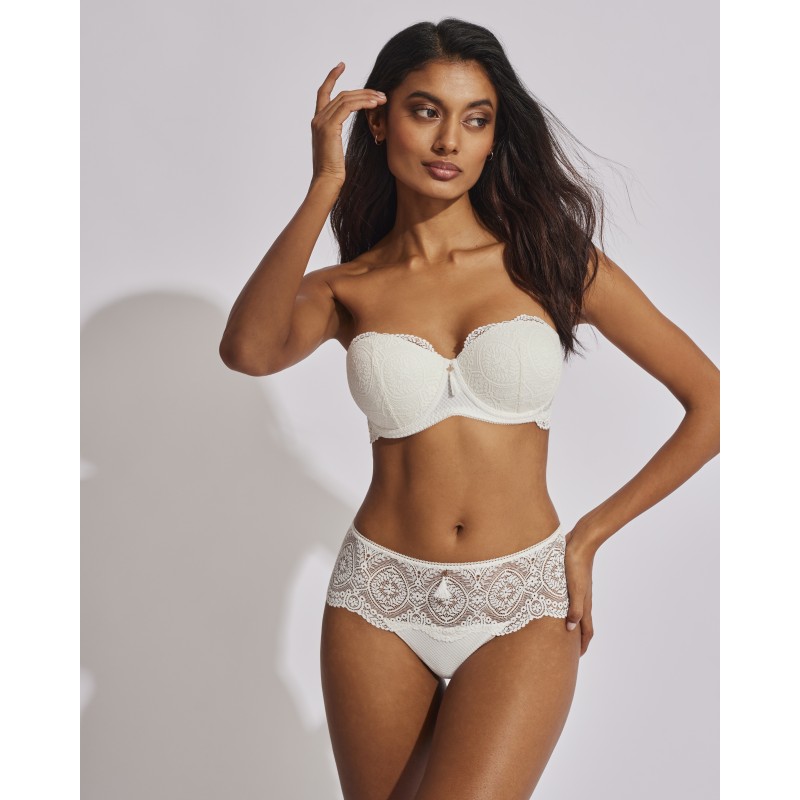 Strapless padded bra. Push up effect, enhances the breast and increases up to one size. Its spectacular lace design gives it a romantic and bohemian style at the same time. This garment combines sensuality, freshness and elegance, ideal for free and authentic women.