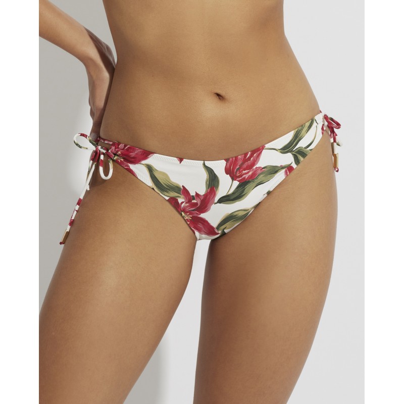 Low-rise bikini bottoms with adjustable knots. With a tropical print that evokes the beauty of a paradise island. Its color and freshness transmit the joy and energy of the most anticipated season of the year.