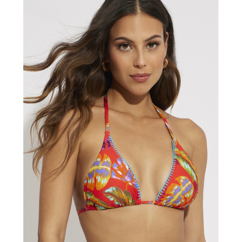 Bikini top with triangle neckline. With removable cup. With a colorful and vibrant print that will give freshness and life to your days at the beach or pool.