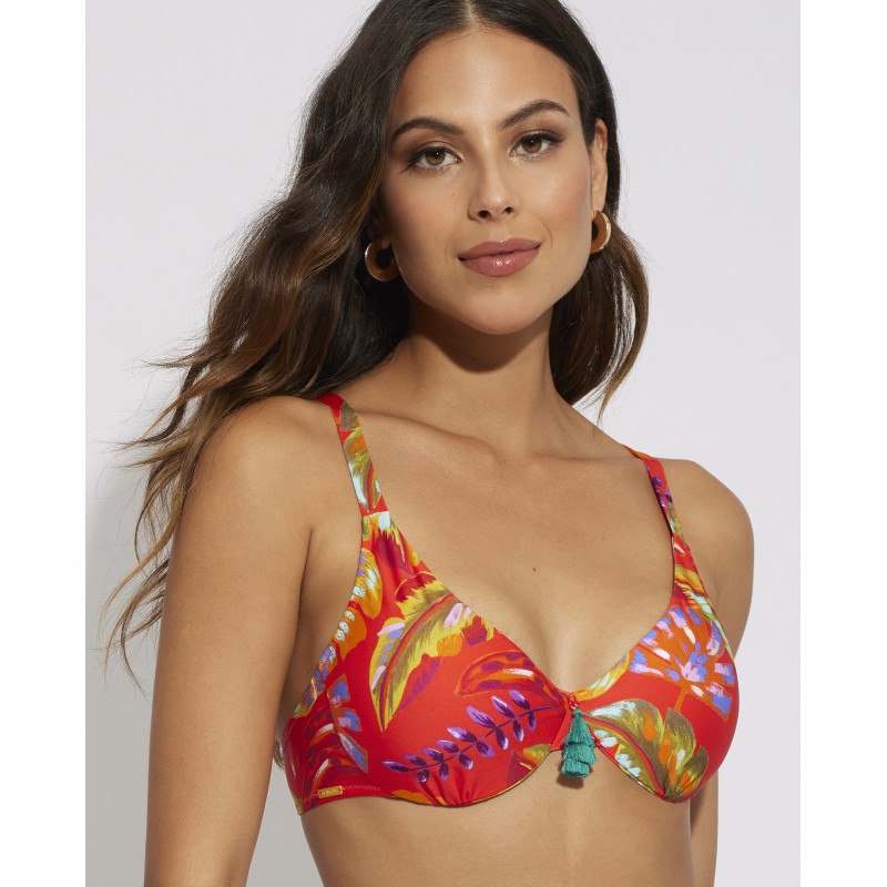 Bikini top with underwire and without foam. It provides perfect support and maximum comfort. With a colorful and vibrant print that will give freshness and life to your days at the beach or pool.