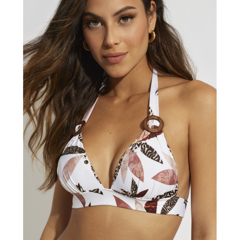 Bikini top with triangle neckline. With removable cup. Its jungle print conveys a feeling of freshness, joy and exoticism. It is a perfect piece to show off a wild and tropical style on the beach or pool.