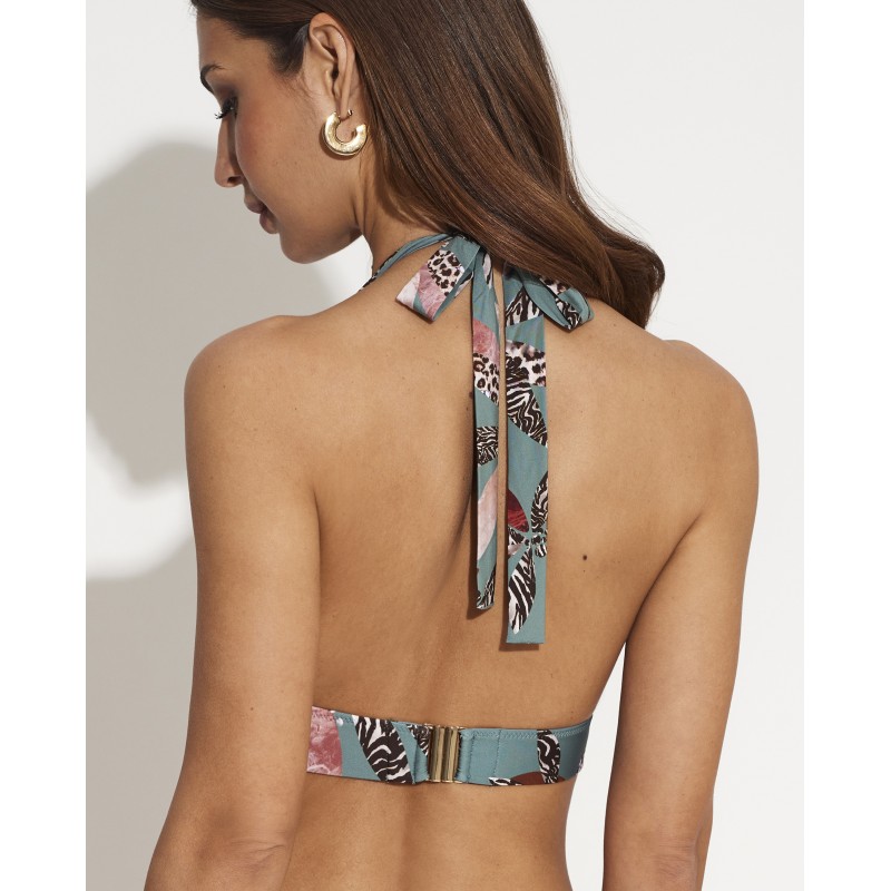 Bikini top with triangle neckline. With removable cup. Its jungle print conveys a feeling of freshness, joy and exoticism. It is a perfect piece to show off a wild and tropical style on the beach or pool.