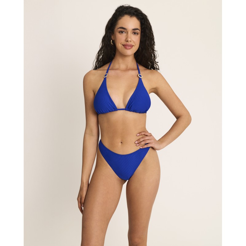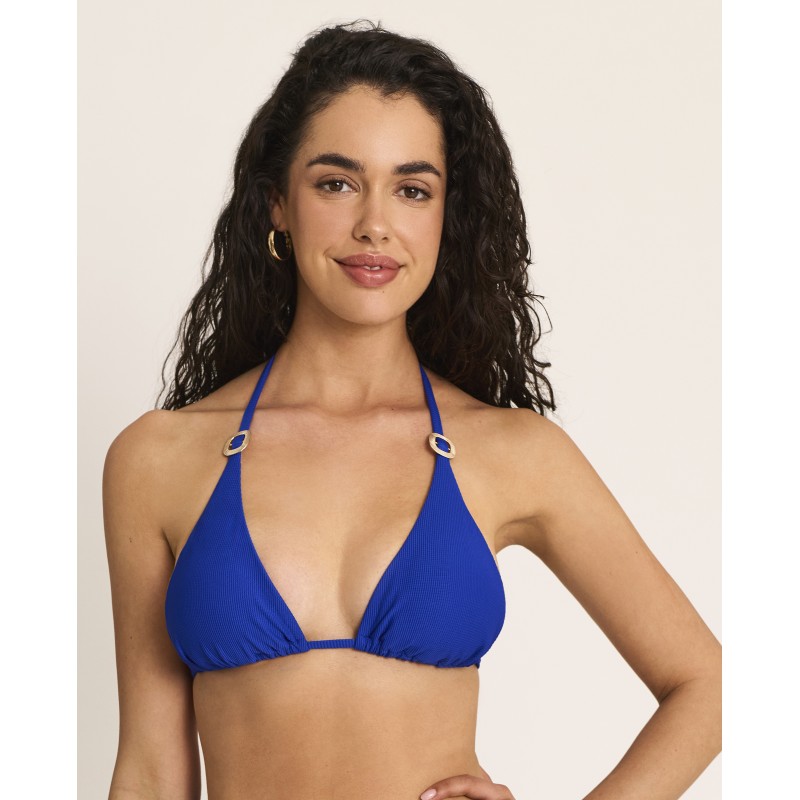 Bikini top with a triangle neckline. Features foam padding and multi-position straps. Its uniform color and timeless style make it ideal for showing off this season.