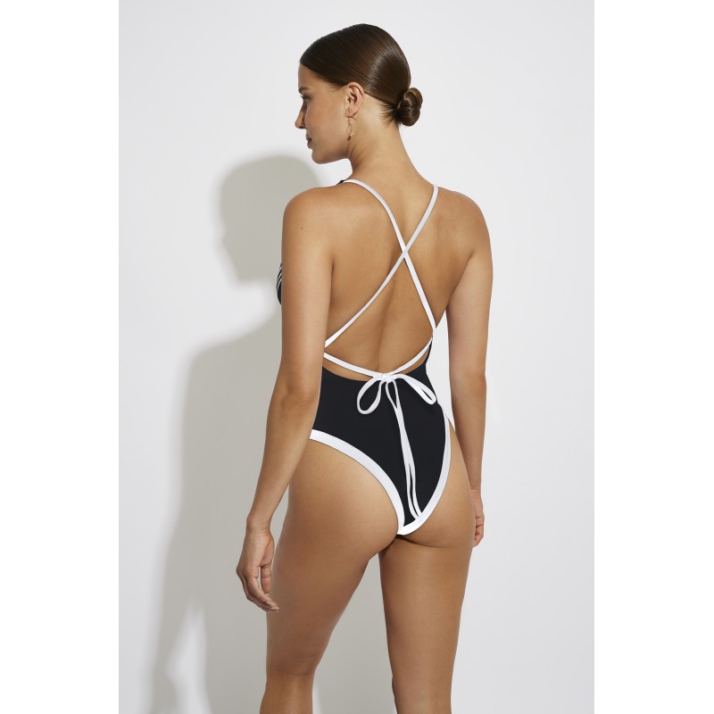 Triangular low-cut swimsuit without inner cup and without underwire. Its black and white design gives it a retro, elegant and seductive style.
