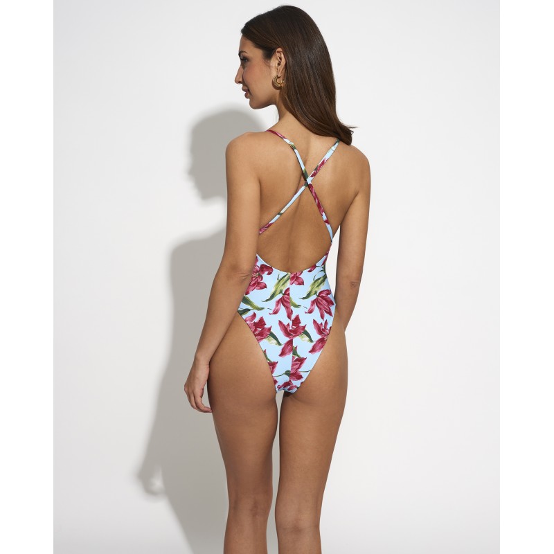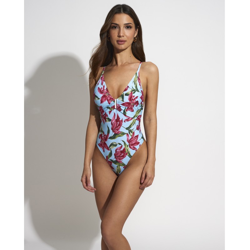 Triangular low-cut swimsuit without inner cup and without underwire. With a tropical print that evokes the beauty of a paradise island. Its color and freshness transmit the joy and energy of the most anticipated season of the year.
