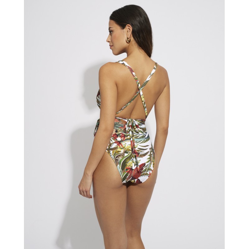 Triangular low-cut swimsuit without inner cup and without underwire. This spectacular design with vibrant tones inspired by wild flora and fauna reflects the exuberance and vitality of tropical wild nature.