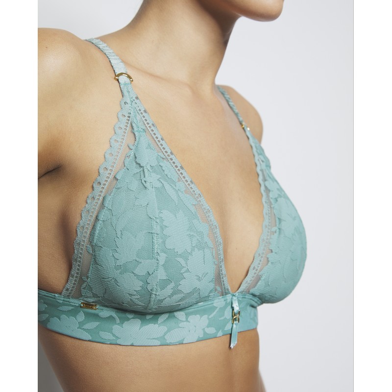 Triangular bra without wiring and foam cup. Provides extra comfort. This garment is a promise of special moments, a touch of mystery and seduction that transforms the power of femininity in its most refined and captivating form.