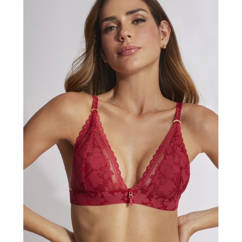 Triangular bra without wiring and foam cup. Provides extra comfort. This garment is a promise of special moments, a touch of mystery and seduction that transforms the power of femininity in its most refined and captivating form.