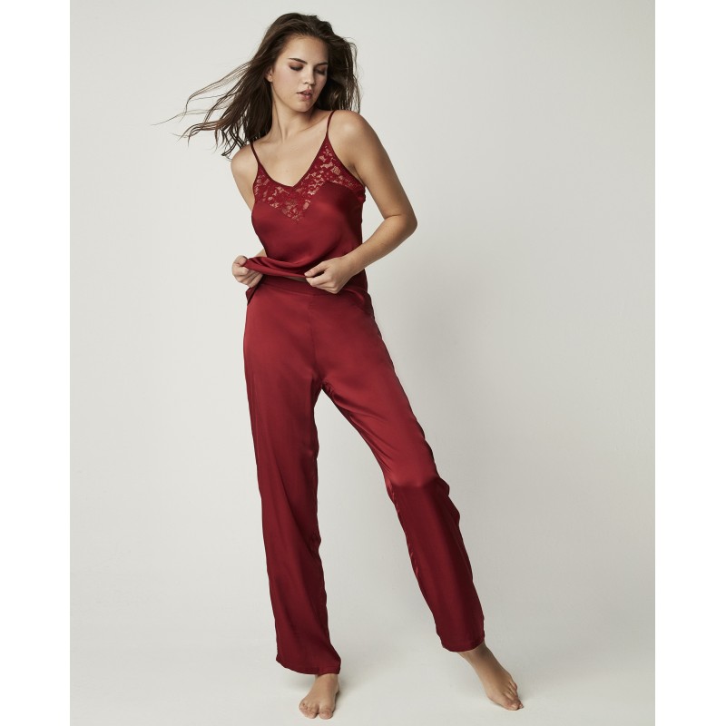 Lingerie pajamas consisting of a top with adjustable straps with floral lace and long pants with an elastic waist. A sophisticated piece of lingerie in which elegance and comfort go hand in hand. The Federica collection, to which it belongs, is characterized by shapes and structures crafted with precision to enhance the contours of each woman and empower her confidence, celebrating individuality and femininity in its maximum expression.