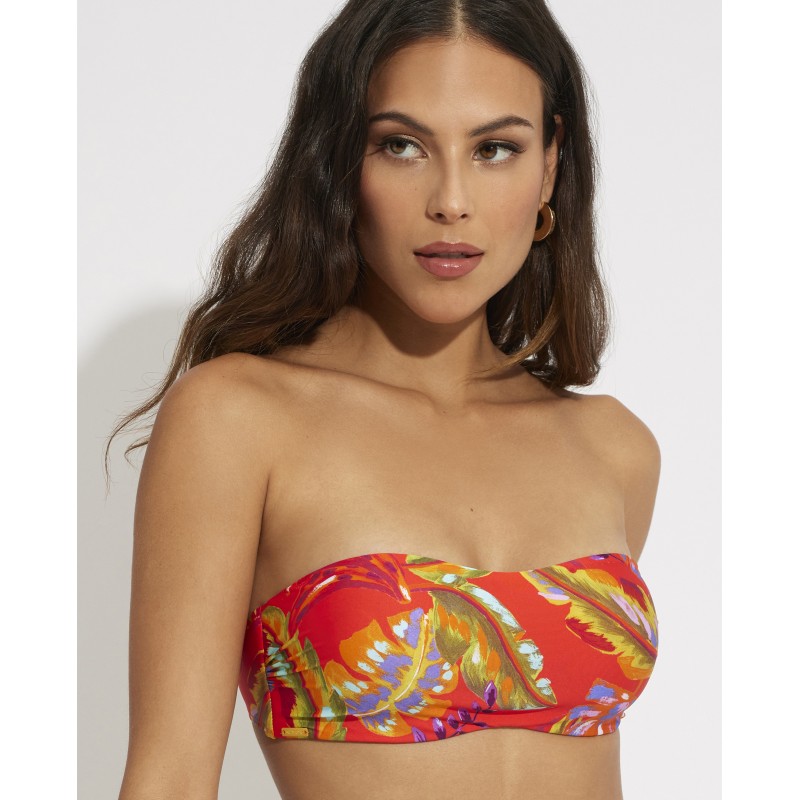 Bandeau bikini top with removable cup and underwire. With removable straps. With a colorful and vibrant print that will give freshness and life to your days at the beach or pool.