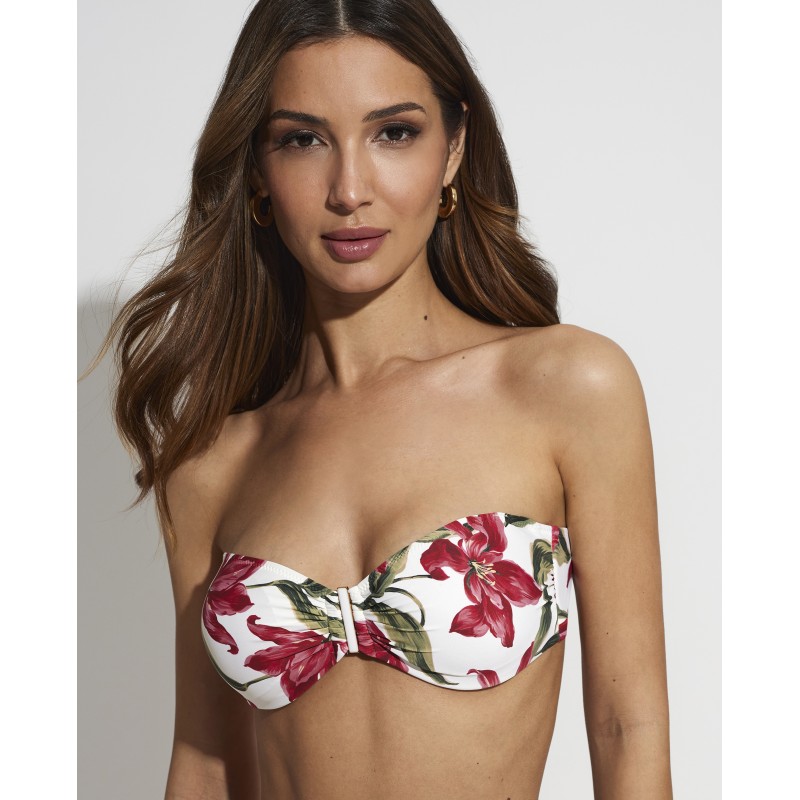 Bandeau bikini top with removable cup and underwire. With removable straps. With a tropical print that evokes the beauty of a paradise island. Its color and freshness transmit the joy and energy of the most anticipated season of the year.