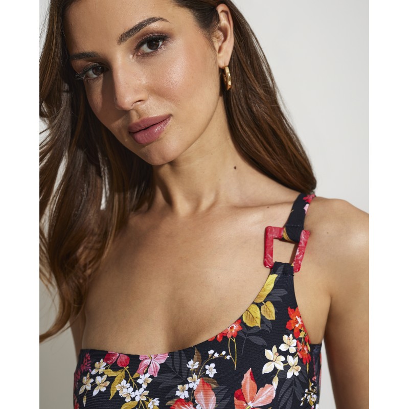 Bandeau bikini top with removable cup and underwire. With removable straps. This floral and colorful design is perfect for looking radiant and vibrant at the beach or pool this summer.