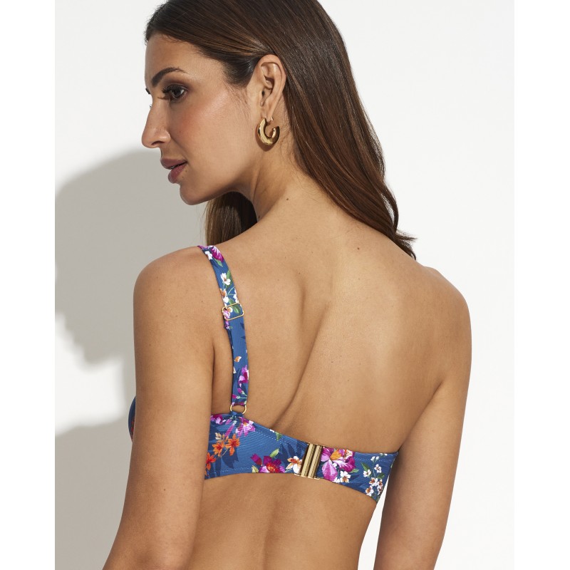 Bandeau bikini top with removable cup and underwire. With removable straps. This floral and colorful design is perfect for looking radiant and vibrant at the beach or pool this summer.