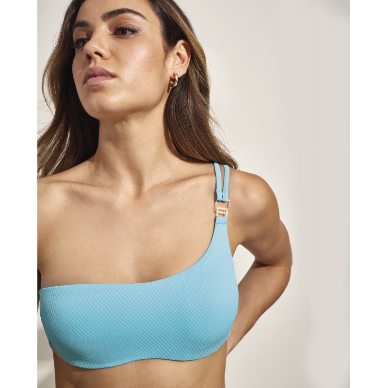 Bandeau bikini top with removable cups and underwire. With removable straps. This versatile design is perfect for those who want a garment that adapts to various occasions and styles. Its comfortable and secure fit allows you to enjoy water activities without worries, whether at the beach or in the pool. Without a doubt, it is a classic, practical and elegant option for summer, ideal for looking good while having fun in the sun.