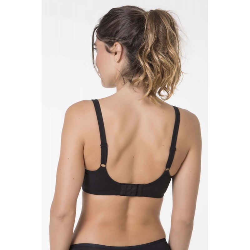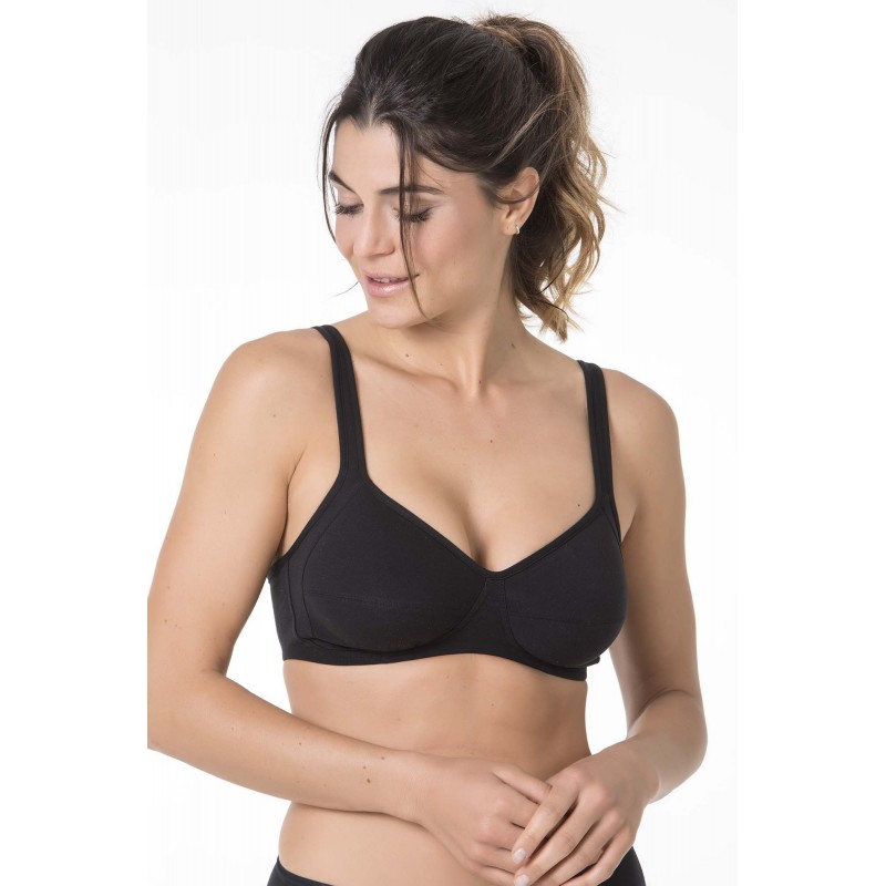 Black bra developed for the processes of radiotherapy, or ofr sensitive skin to which any synthetic element, in contact with the skin, leaves them signs typical of an allergic behaviour. Bra made 100% with natural hypoallergenic materials, with padded straps and seamless on contact with the skin.