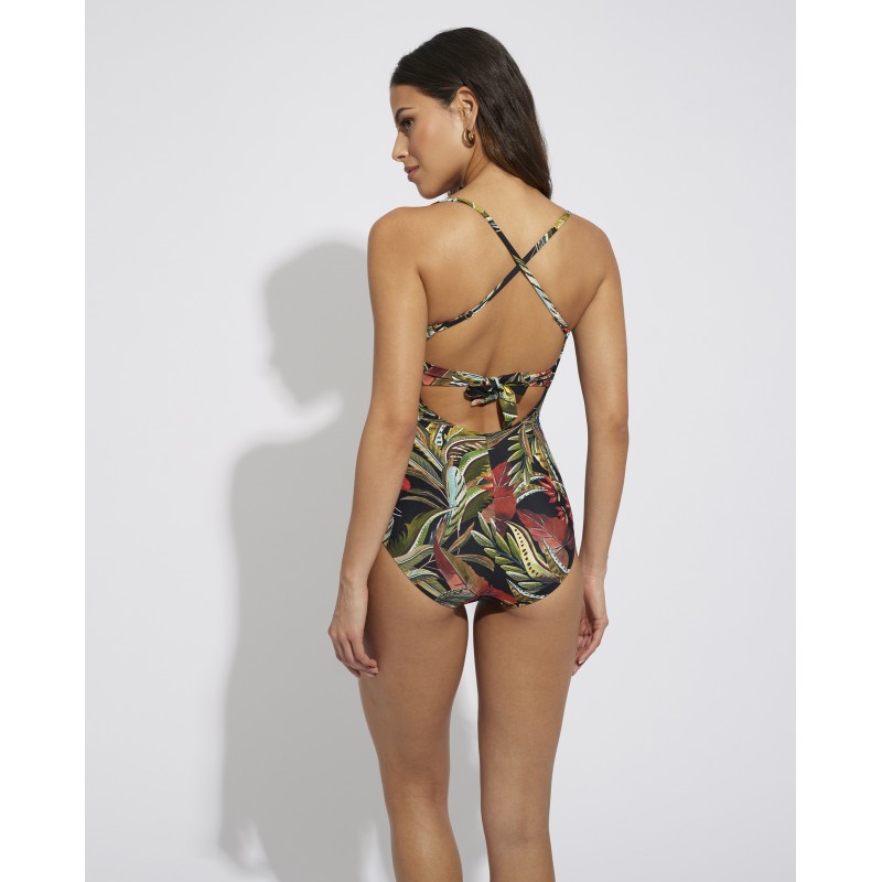 Women's swimsuit with a square neckline. With inner cup, no underwire and crossed straps. This spectacular design with vibrant tones inspired by wild flora and fauna reflects the exuberance and vitality of tropical wild nature.