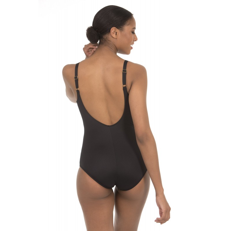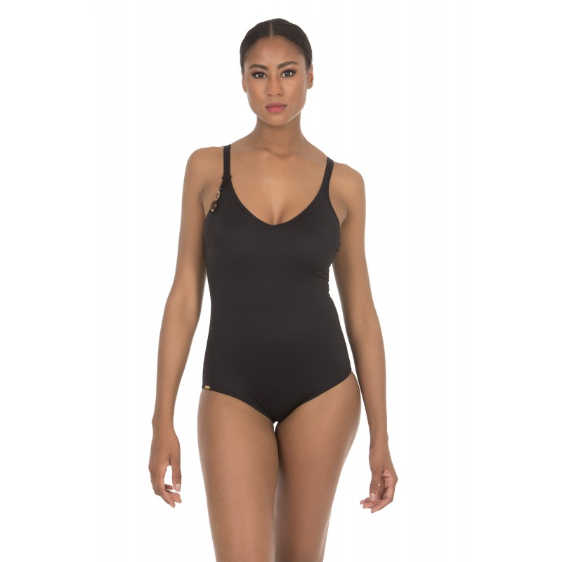 Wireless swimsuit with v neck. With cups and wide straps for a perfect fit. Black.