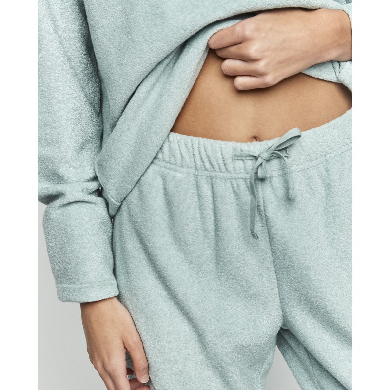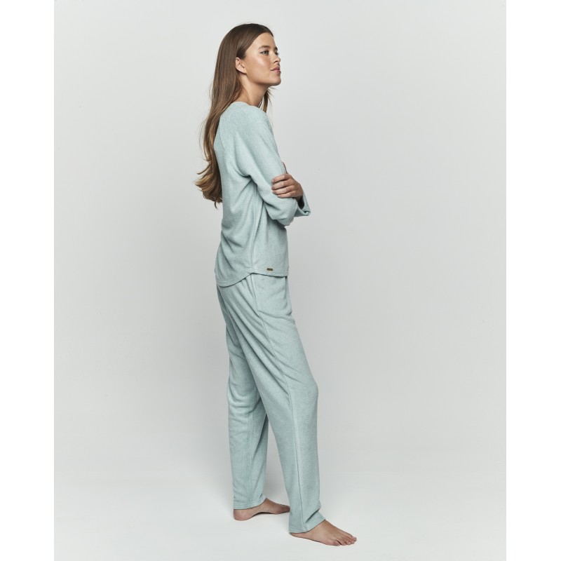 Women's two-piece pajamas. Made of extra-soft fabric, they include a long-sleeved round-neck top and long pants with pockets and an adjustable tie. A garment designed to envelop your nights in warmth and comfort, because there's no feeling more comforting than feeling at home.