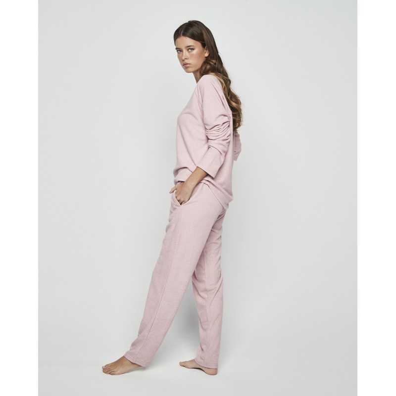 Women's two-piece pajamas. Made of extra-soft fabric, they include a long-sleeved round-neck top and long pants with pockets and an adjustable tie. A garment designed to envelop your nights in warmth and comfort, because there's no feeling more comforting than feeling at home.