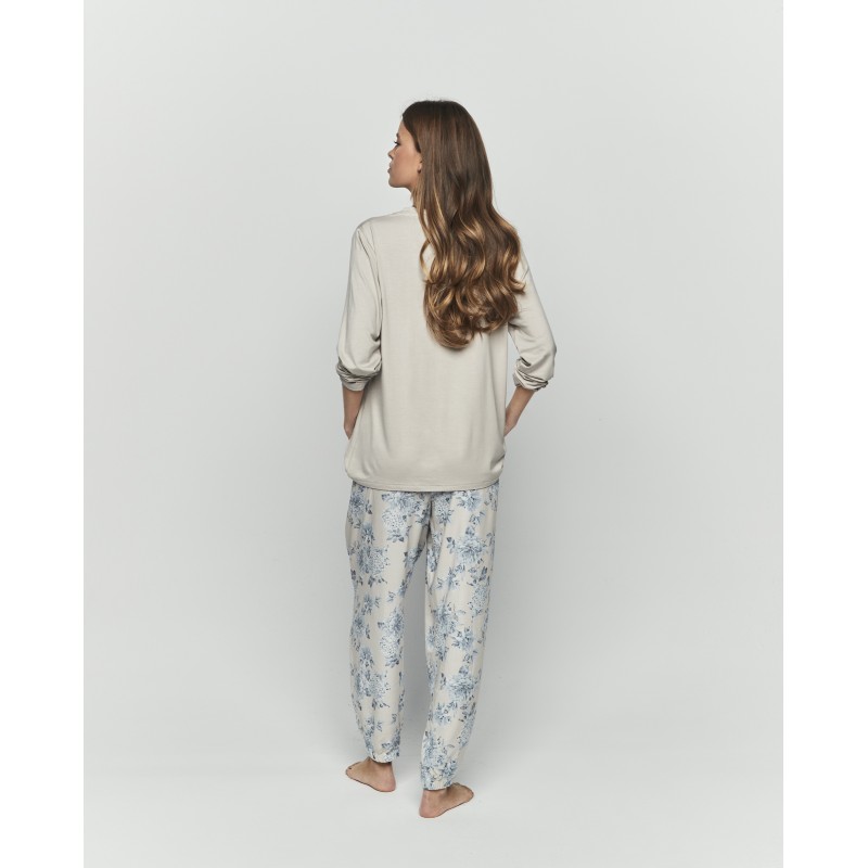 Women's two-piece pajamas. Made of extra-soft fabric, they include a long-sleeved V-neck top and bottoms, along with long cuffed pants. The delicate floral print in pastel shades adds a romantic and elegant touch, perfect for cozy, subtle nights.