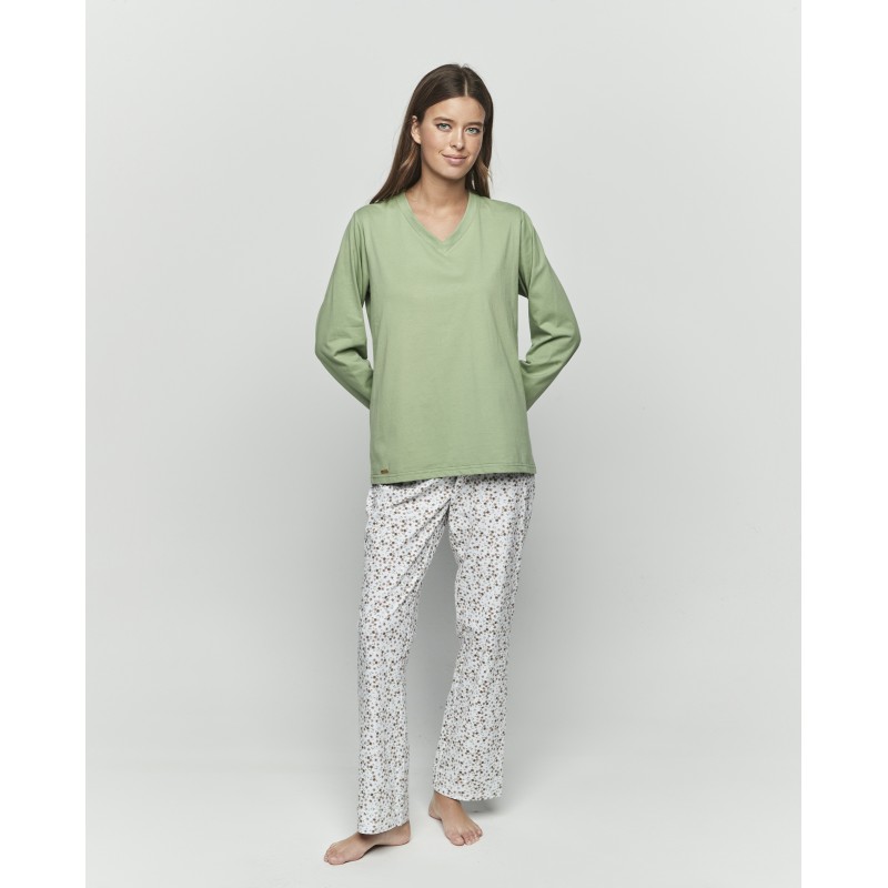 Women's two-piece pajamas. Includes a plain long-sleeved V-neck top and bottoms, along with long pants with a romantic floral print that provides softness, freshness, and charm. Absolute comfort for your moments at home.