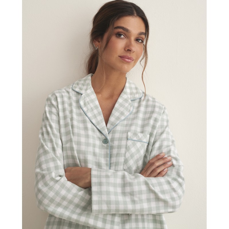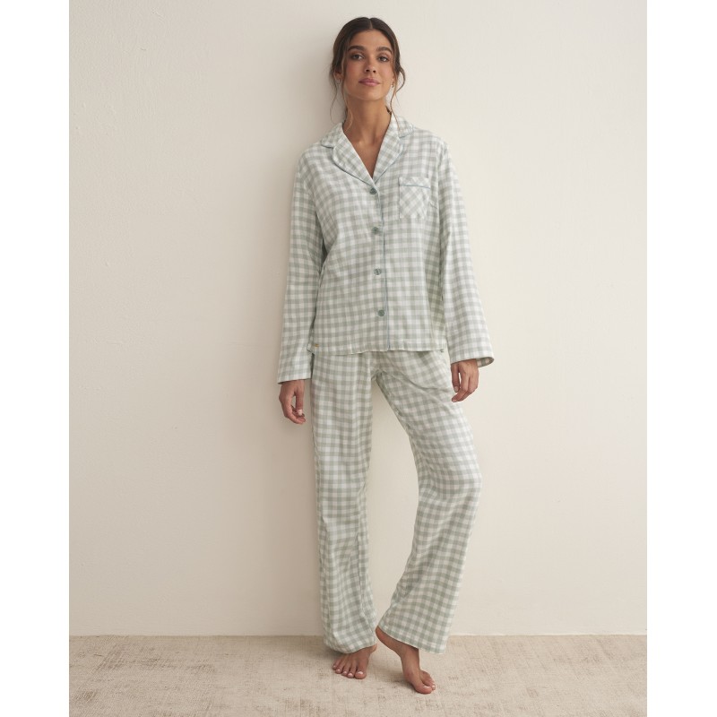 Women's shirt pajamas with V-neck and front opening with buttons and long pants with pockets. Vichy design and 100% cotton fabric. This set is a comfortable and classic option for sleeping in style. Ideal for this season.