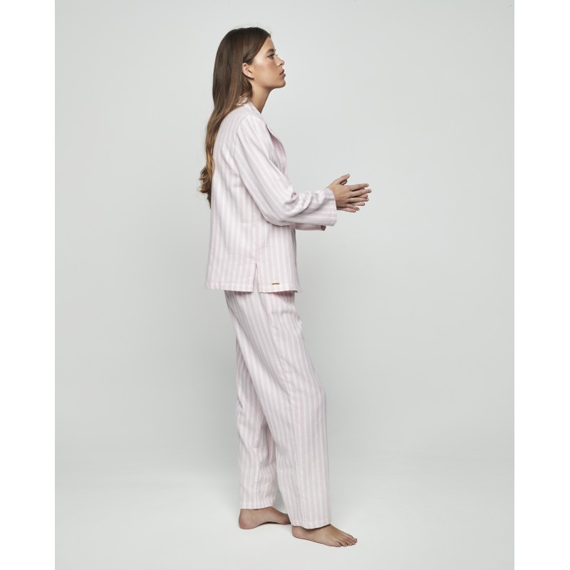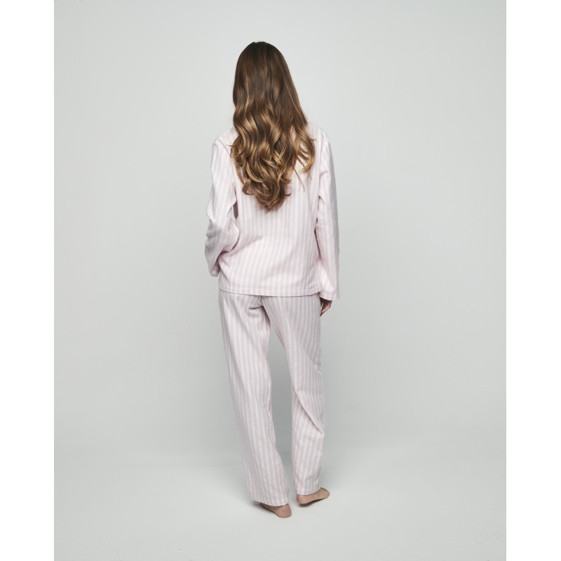 Women's two-piece pajamas. Featuring a button-front shirt-style top; the bottom features long pants with an adjustable tie, classic and elegant. The vertical stripes enhance the design and give it a classic touch. These garments have a soft, light, and pleasant texture and are 100% cotton.