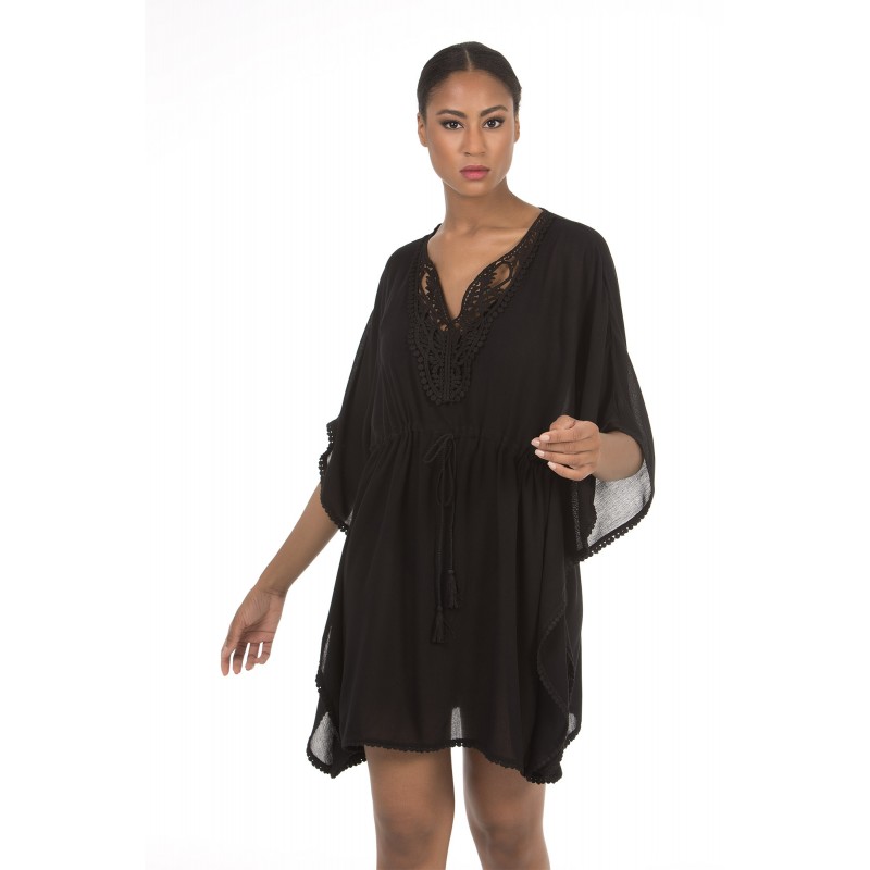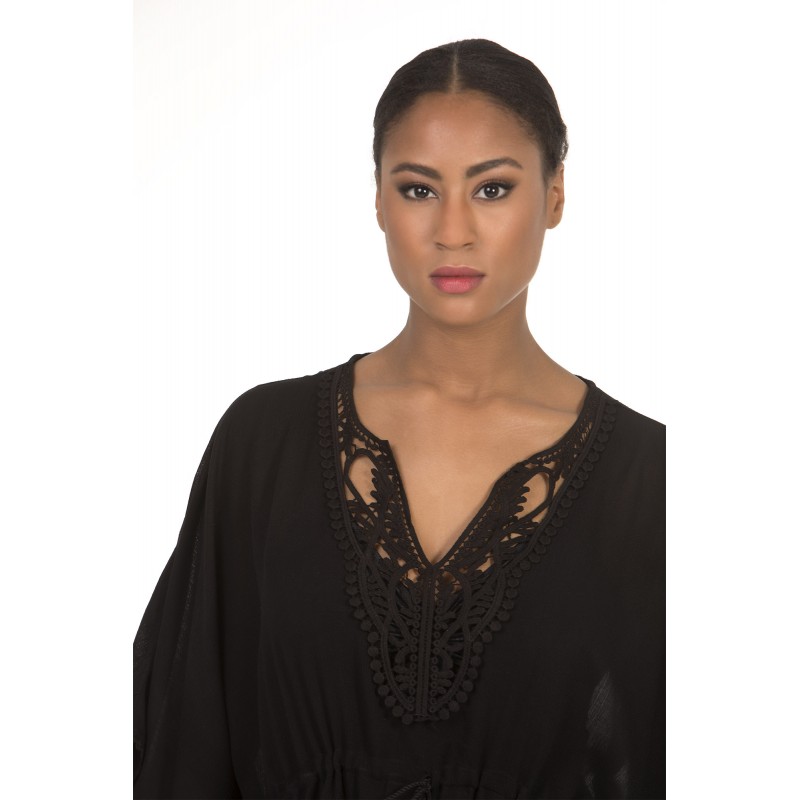 Blusa solta manga francesa e transparencias no decote. Em preto.