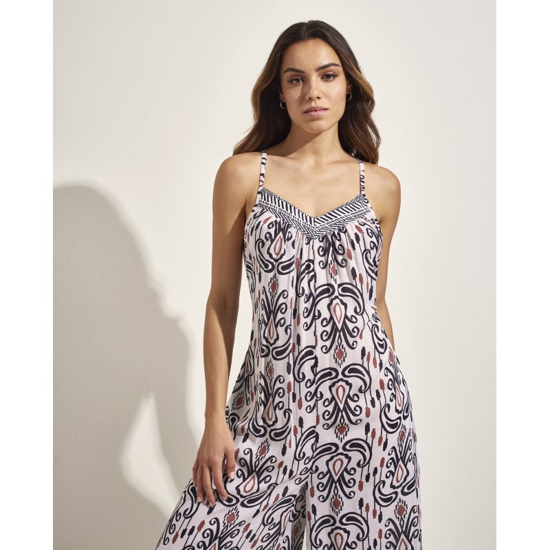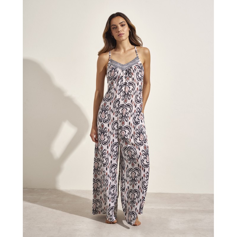 Macacão com suspensórios. Deixe a sua personalidade brilhar com este design, onde cada detalhe do estampado conta uma história de cor e elegância.