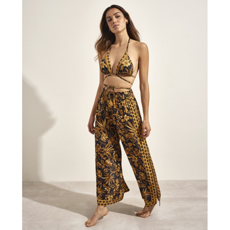 Calça estilo palazzo com rachas laterais. Ouse destacar-se com um design único que alia sofisticação e modernidade graças ao seu estampado inovador e corte irrepreensível. Ideal para completar o seu look de verão.