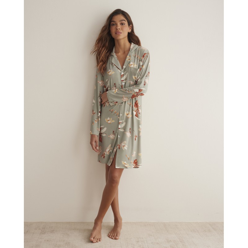 Camisola estilo camisa. Fluido, com abertura frontal composta por botões, e manga comprida. Estampado floral.
