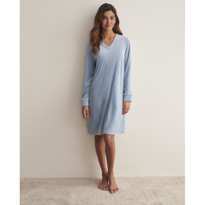 Camisa de noite de manga comprida. Com decote em V, bolsos e tecido polar. Este material macio, quente e aveludado proporciona uma sensação de grande conforto e mantém o corpo quente durante a noite. Ideal para tempos frios.