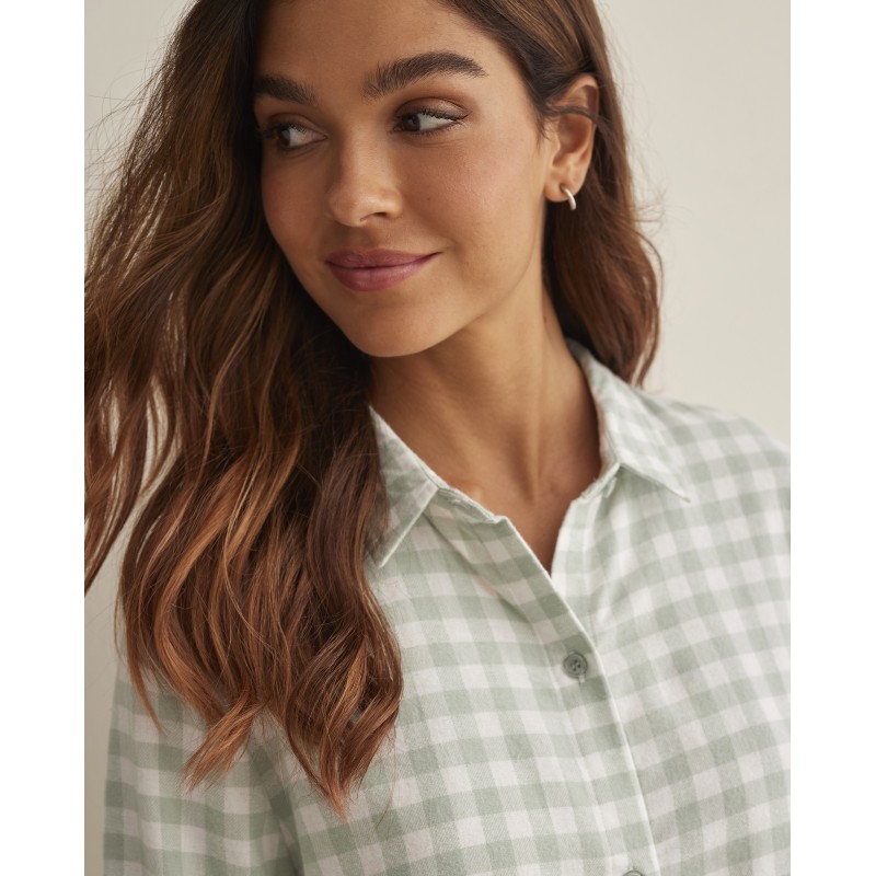 Camisa de noite de manga comprida com abertura frontal por botão. O seu estampado riscado e o tecido 100% algodão tornam-na numa peça confortável, quente e elegante, ideal para esta estação.