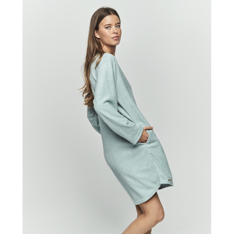 Camisola de manga comprida. Confecionada em tecido extramacio, com gola redonda e comprimento até ao joelho. Uma peça pensada para envolver as suas noites em aconchego e conforto, porque não há sensação mais reconfortante do que se sentir em casa.