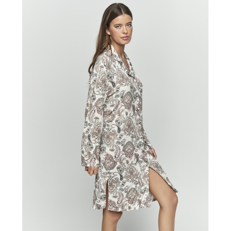 Camisola estilo camisa com mangas e botões até ao joelho. Relaxe com estilo com esta camisola clássica, cujo estampado requintado combina elegância e conforto para o seu descanso.