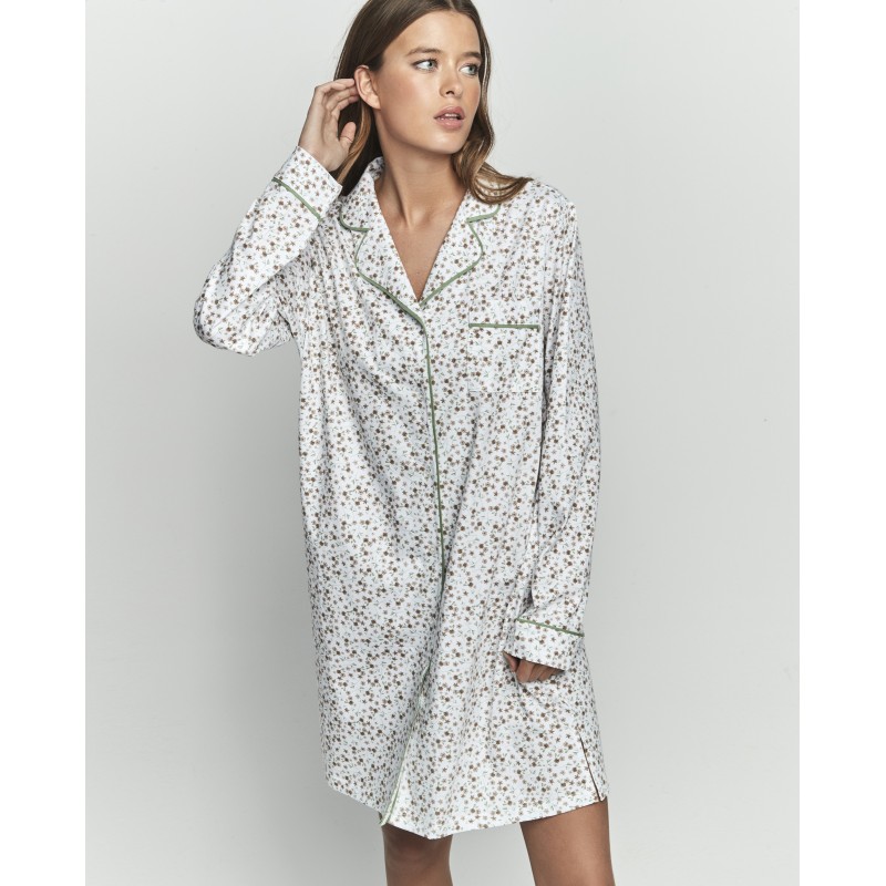 Camisola estilo camisa com mangas e botões frontais até ao joelho. Apresenta um estampado floral romântico que oferece suavidade, frescura e charme numa única peça.