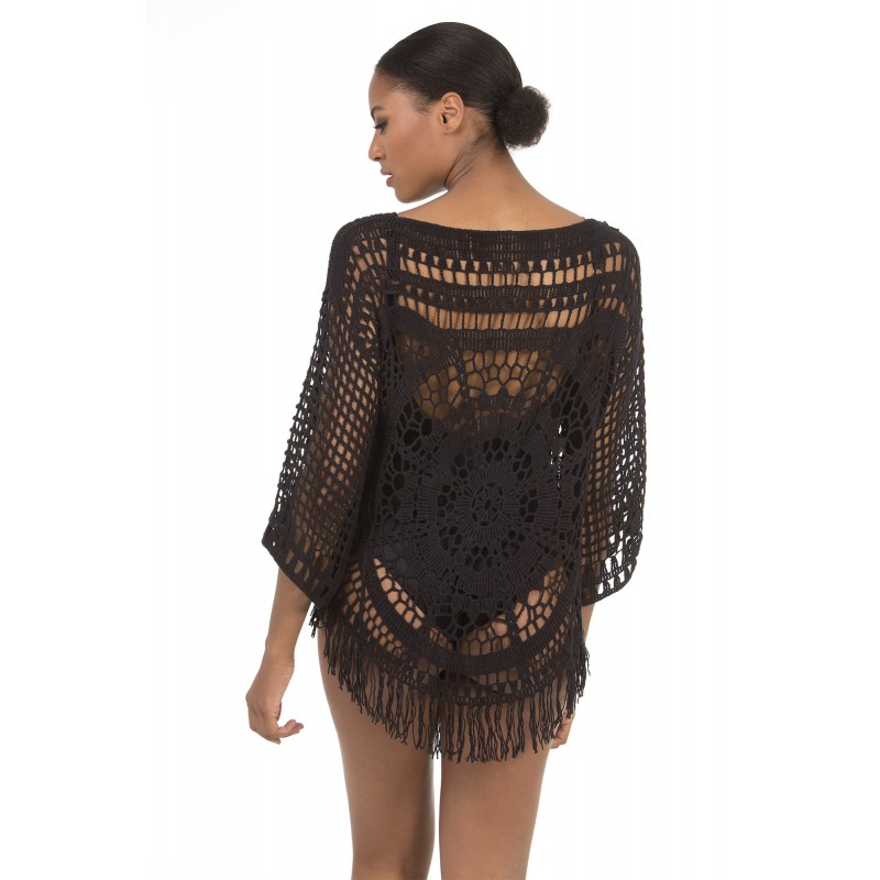 Camisola em crochet de manga comprida com franjas na parte de baixo. Em preto.