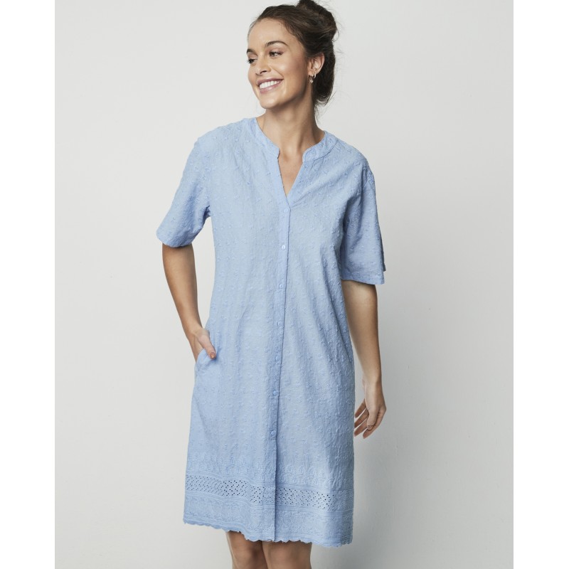 Camisola de manga curta confecionada em 100% algodão. Possui fecho frontal com botões estilo camisa e gola estilo Mao. Os seus detalhes bordados e a bainha na parte inferior fazem dela uma peça elegante, confortável e cool. Ideal para a época de verão.