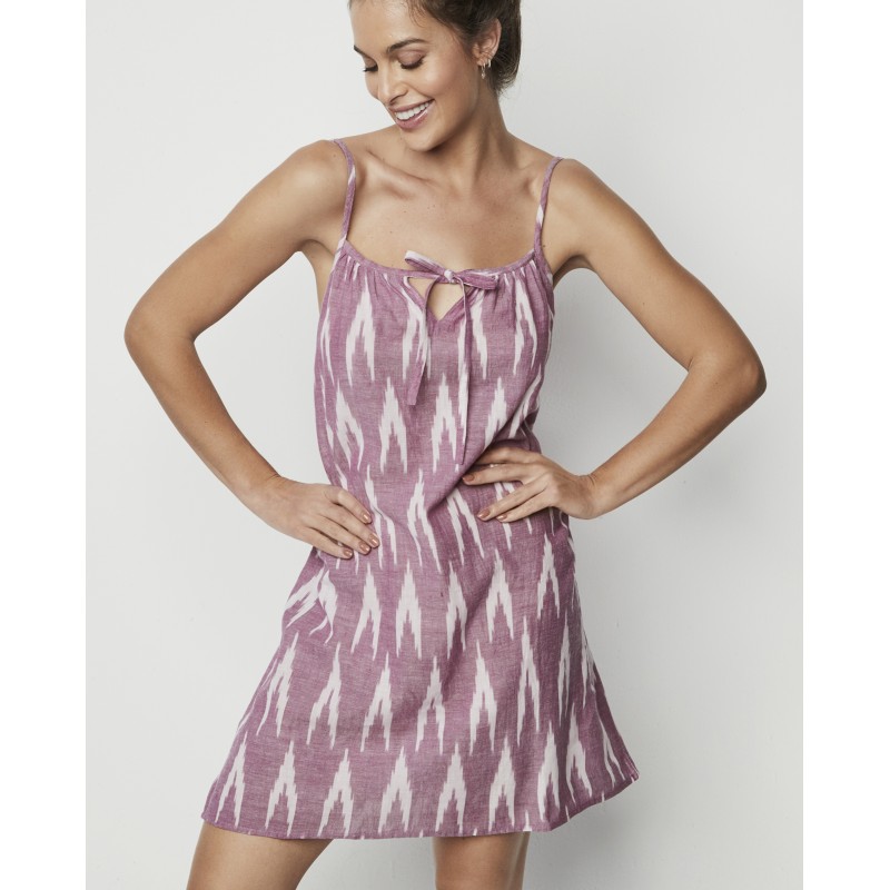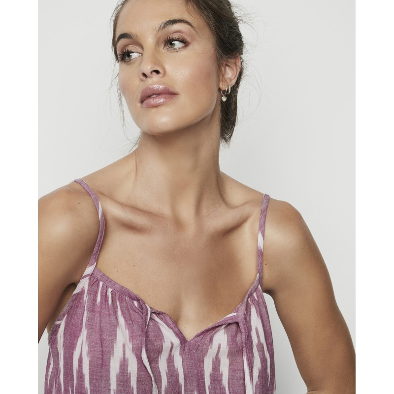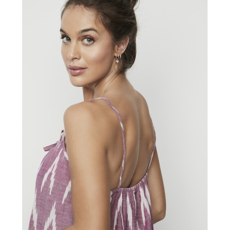 Camisola curta de alças finas com laço no peito. 100% algodão. O seu estampado de estilo étnico faz dela uma peça original que evoca frescura e um estilo muito jovem.