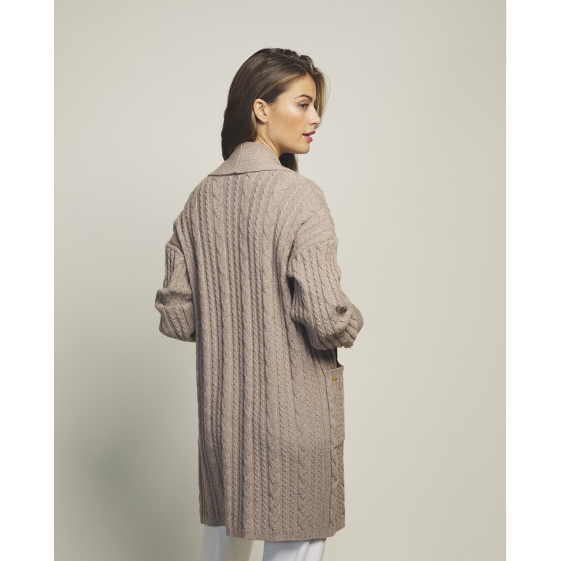 Cardigã longo de malha com corte clássico e bolso. Ideal para usar por cima de uma camisola ou pijama.