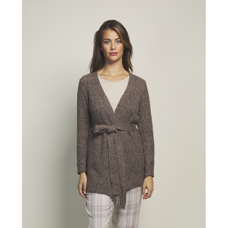 Cardigã longo de malha com corte clássico e cinto. Ideal para usar por cima de uma camisola ou pijama.