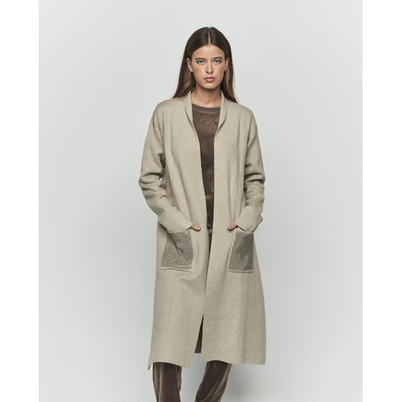 Casaco comprido feminino. Os seus bolsos brilhantes conferem um toque elegante e chique que faz toda a diferença.